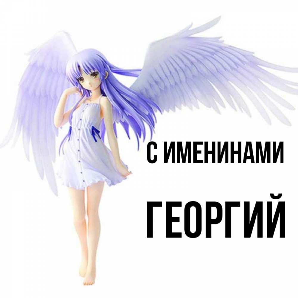 Открытка С именинами Георгий. ангел аниме с фиолетовыми волосами. девушка ангел с фиолетовыми крыльями