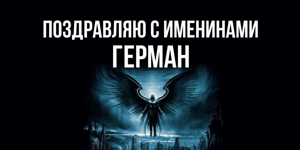Открытка Поздравляю с именинами Герман. Открытка на день ангела, ангел на фоне неба и города. ангел, день ангела