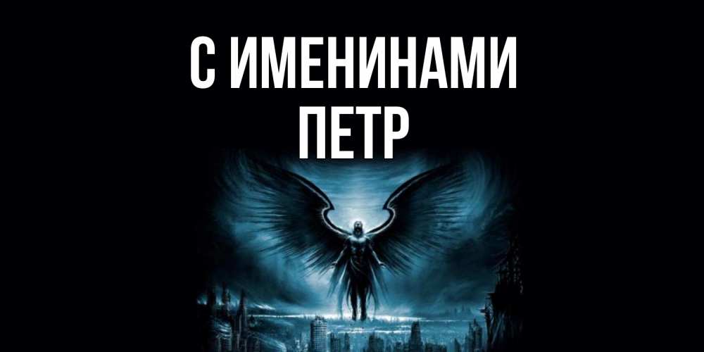 Открытка С именинами Петр. Открытка на день ангела, ангел на фоне неба и города. ангел, день ангела
