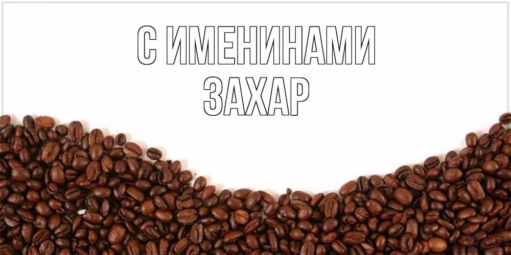 Открытка С именинами Захар. Доброе утро с кофейными зернами. текст на белом фоне и снизу кофейные зерна