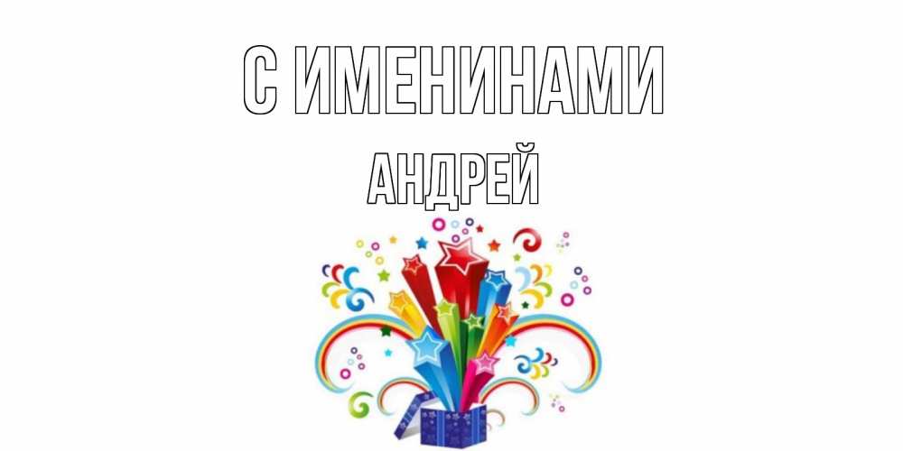 Открытка С именинами Андрей. Открытка ко дню рождения с коробкой и радугой из звезд. Коробка,радуга,звезды