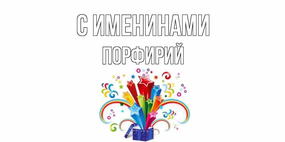 Открытка С именинами Порфирий. Открытка ко дню рождения с коробкой и радугой из звезд. Коробка,радуга,звезды