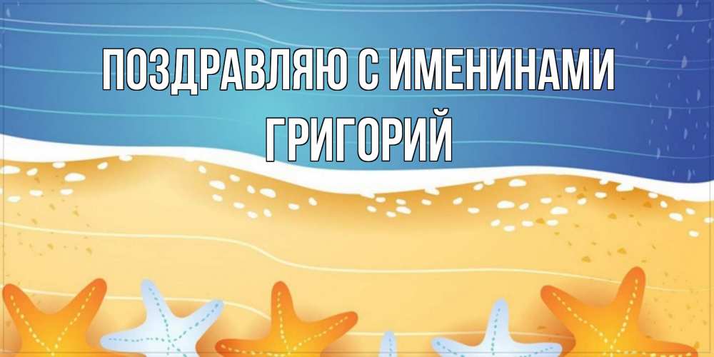 Открытка Поздравляю с именинами Григорий. морской пляж и звезды и песок. красивая морская тема