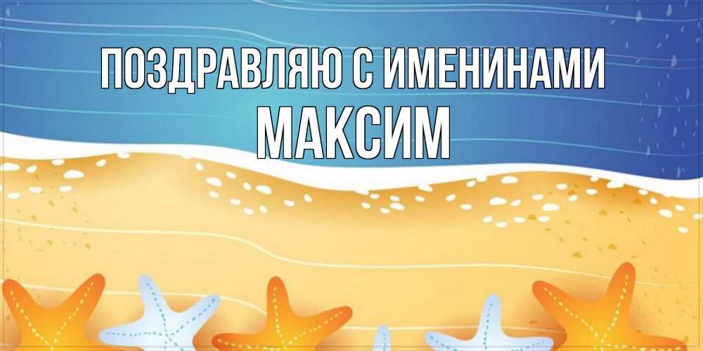 Открытка Поздравляю с именинами Максим. морской пляж и звезды и песок. красивая морская тема