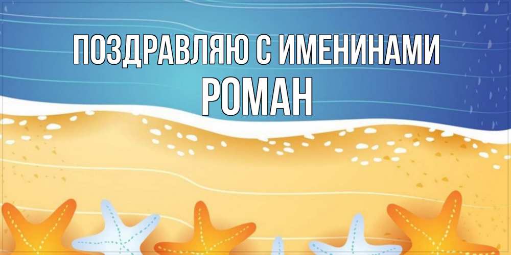 Открытка Поздравляю с именинами Роман. морской пляж и звезды и песок. красивая морская тема