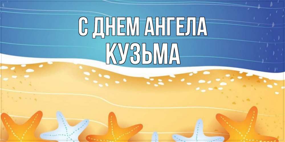 Открытка С днем Ангела Кузьма. морской пляж и звезды и песок. красивая морская тема