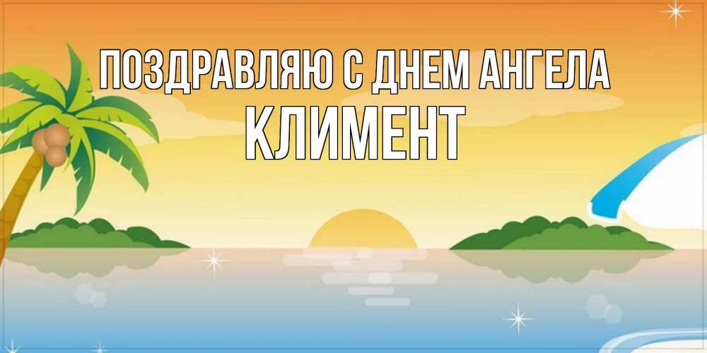 Открытка Поздравляю с днем Ангела Климент. морской пляж и пальма с кокосами. хорошего дня на пляжу
