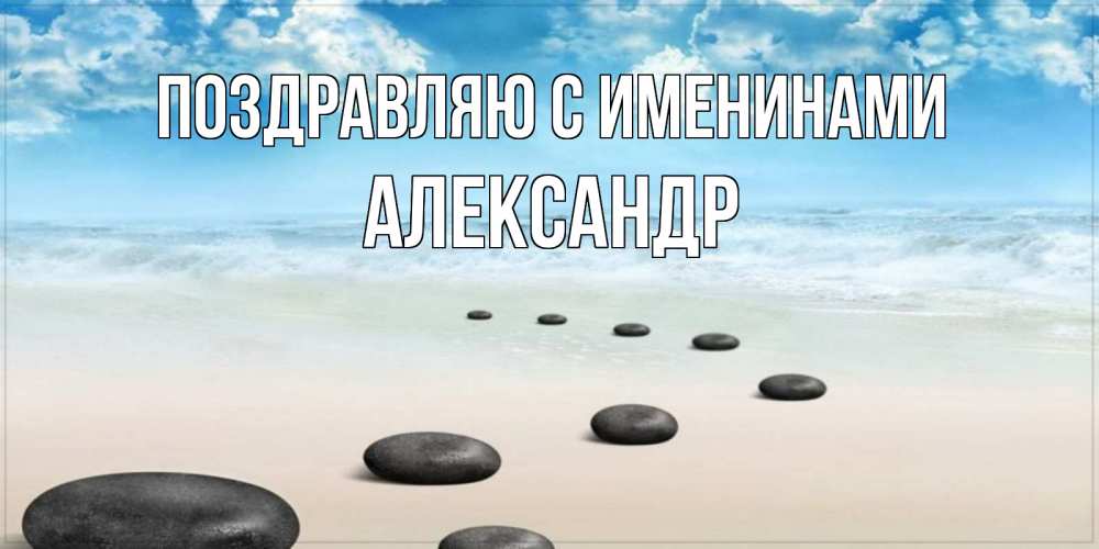 Открытка Поздравляю с именинами Александр. доброе утро с морскими камушками. море небо и песок
