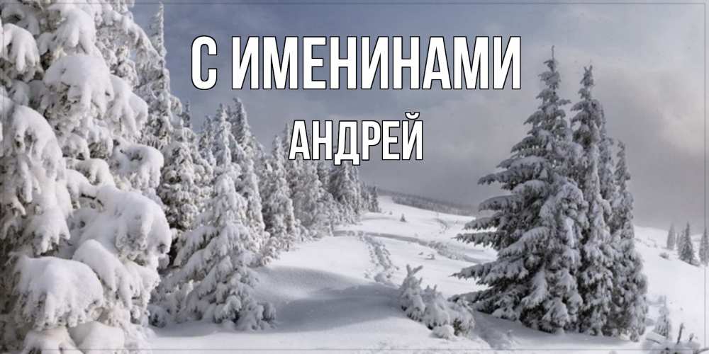 Открытка С именинами Андрей. зимний лес. пасмурное утро