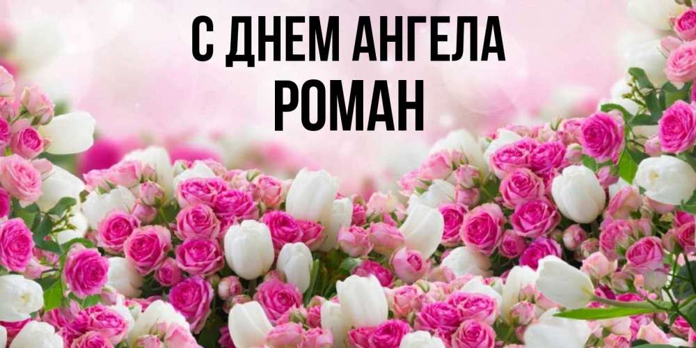 Открытка С днем Ангела Роман. огромное количество роз на открытке. открытка с разными розами