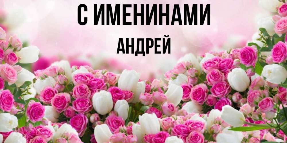 Открытка С именинами Андрей. огромное количество роз на открытке. открытка с разными розами