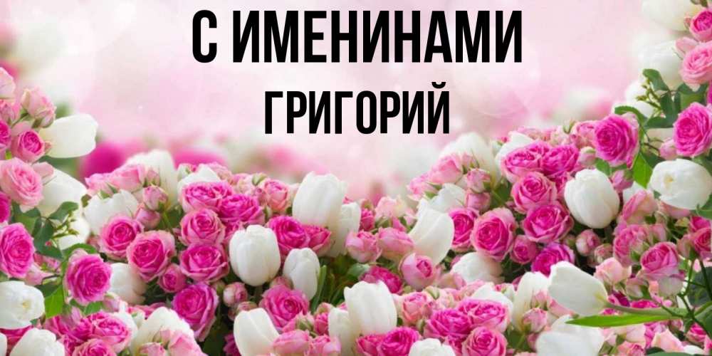 Открытка С именинами Григорий. огромное количество роз на открытке. открытка с разными розами