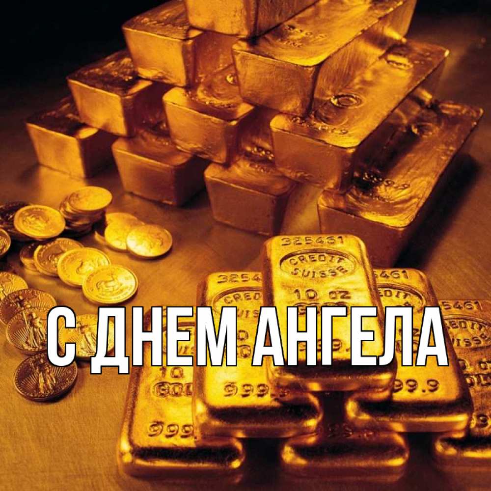 Открытка С днем ангела. с золотом . со слитками золота и золотыми монетами С юбилеем
