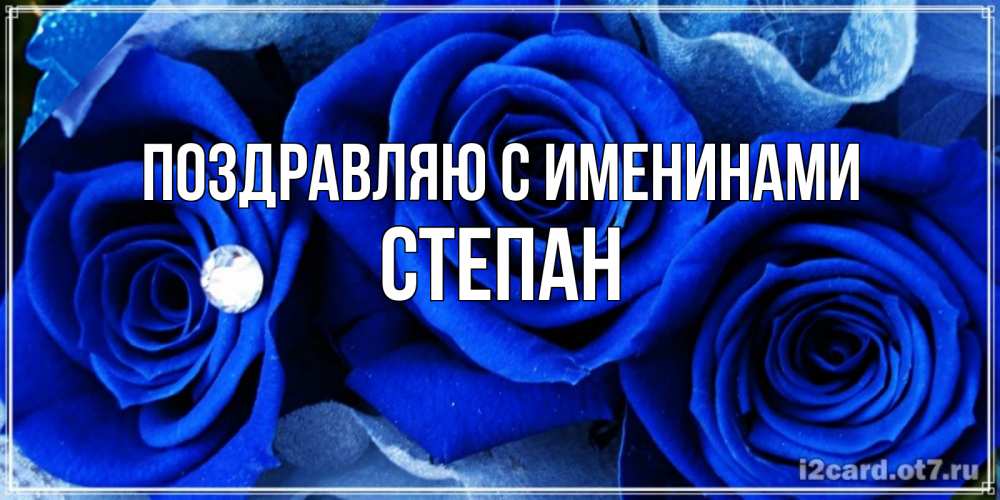 Открытка Поздравляю с именинами Степан. синяя роза и роса. синие розы в росе