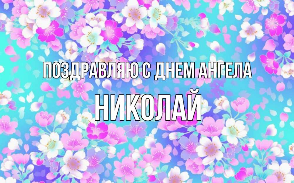 Открытка Поздравляю с днем Ангела Николай. фон с тортиками и подарками. открытка с заливкой