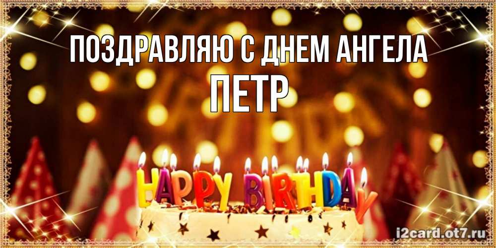 Открытка Поздравляю с днем Ангела Петр. торт с горящими свечками на день рождения. торт и надпись свечками на английском happy birthday
