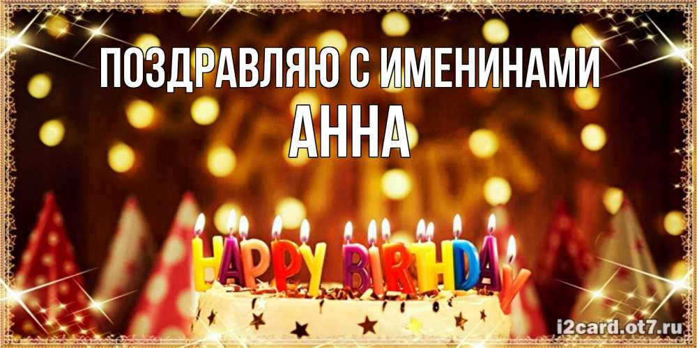 Открытка Поздравляю с именинами Анна. торт с горящими свечками на день рождения. торт и надпись свечками на английском happy birthday