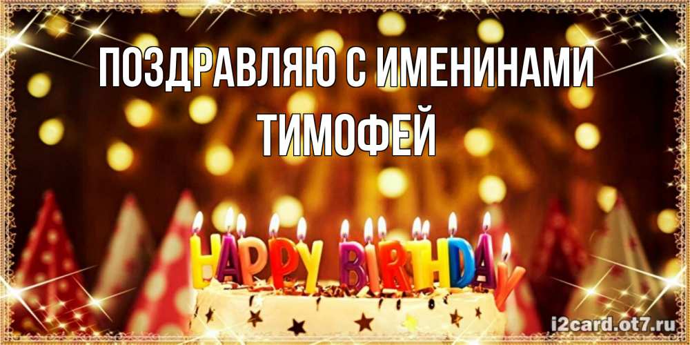 Открытка Поздравляю с именинами Тимофей. торт с горящими свечками на день рождения. торт и надпись свечками на английском happy birthday