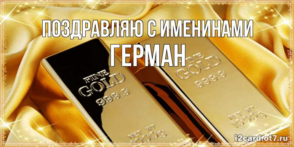 Открытка Поздравляю с именинами Герман. золотые слитки на золотой ткани. золотые слитки лежат шелке золотого цвета