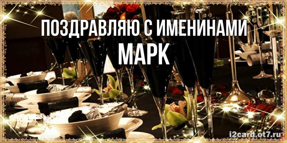 Открытка Поздравляю с именинами Марк. застолье. пожелания на день рождения с столом полным еды