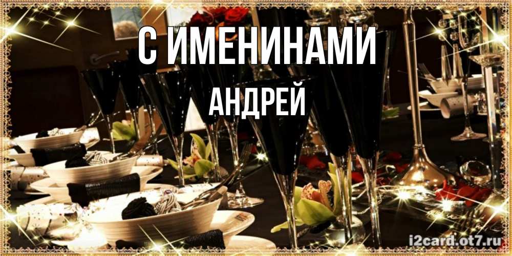Открытка С именинами Андрей. застолье. пожелания на день рождения с столом полным еды