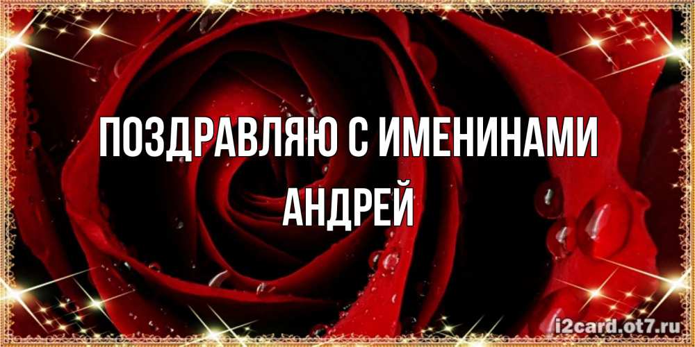 Открытка Поздравляю с именинами Андрей. бордовая роза в росе. цветок в росе на день рождения