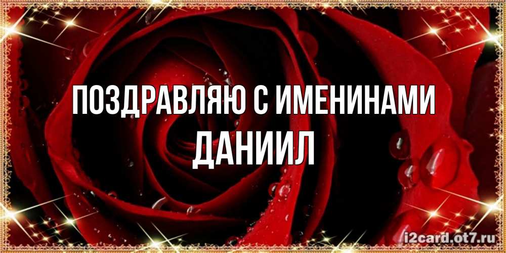 Открытка Поздравляю с именинами Даниил. бордовая роза в росе. цветок в росе на день рождения