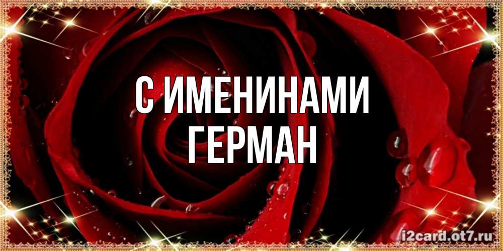 Открытка С именинами Герман. бордовая роза в росе. цветок в росе на день рождения