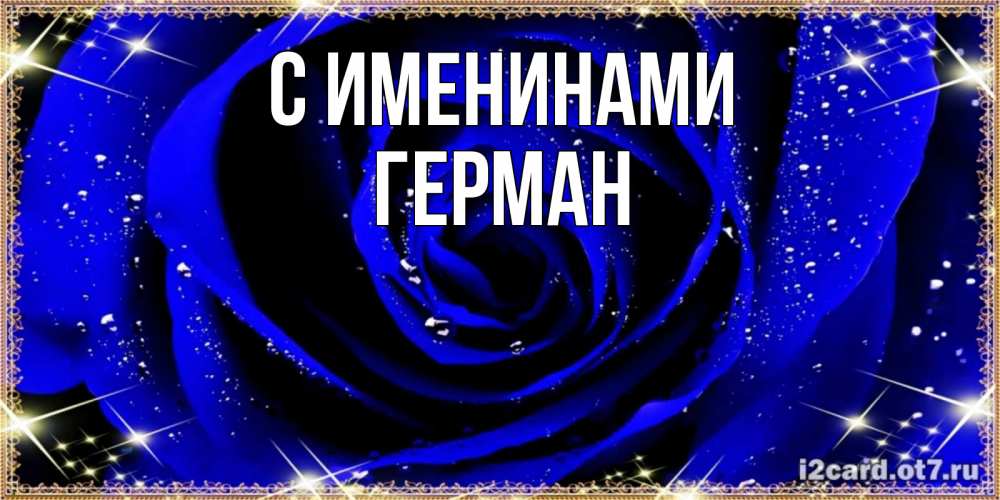 Открытка С именинами Герман. голубая роза на день рождения для дам. голубые цветы в росе