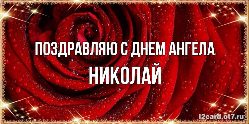 Открытка Поздравляю с днем Ангела Николай. роза в росе и звездах. роса на розе блестящая в лучах солнца