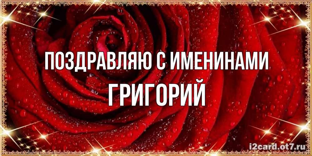 Открытка Поздравляю с именинами Григорий. роза в росе и звездах. роса на розе блестящая в лучах солнца