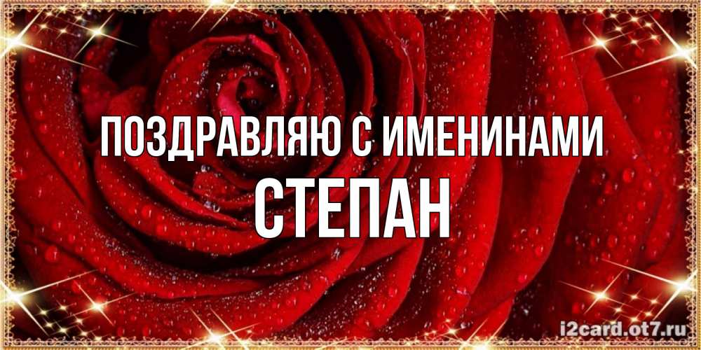 Открытка Поздравляю с именинами Степан. роза в росе и звездах. роса на розе блестящая в лучах солнца