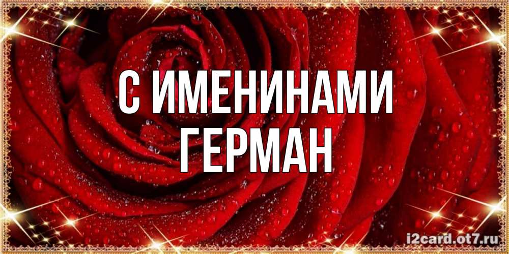 Открытка С именинами Герман. роза в росе и звездах. роса на розе блестящая в лучах солнца
