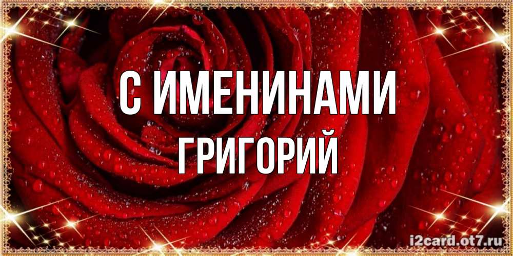 Открытка С именинами Григорий. роза в росе и звездах. роса на розе блестящая в лучах солнца