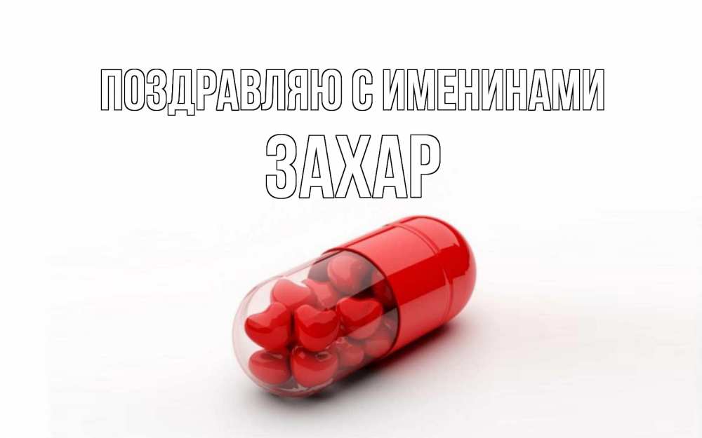 Открытка Поздравляю с именинами Захар. капсула с сердечками. сердце
