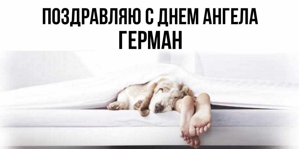 Открытка Поздравляю с днем Ангела Герман. Открытка спокойной ночи с собакой и ногами. кровать с собакой пожелание сладких снов и спокойной ночи