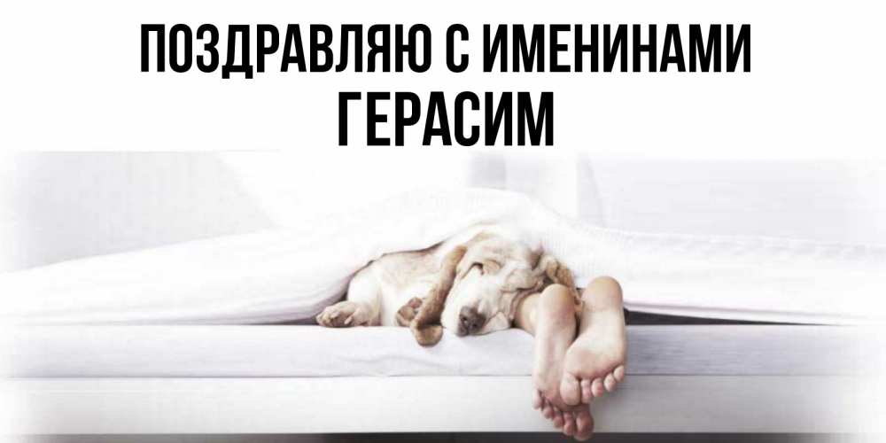 Открытка Поздравляю с именинами Герасим. Открытка спокойной ночи с собакой и ногами. кровать с собакой пожелание сладких снов и спокойной ночи