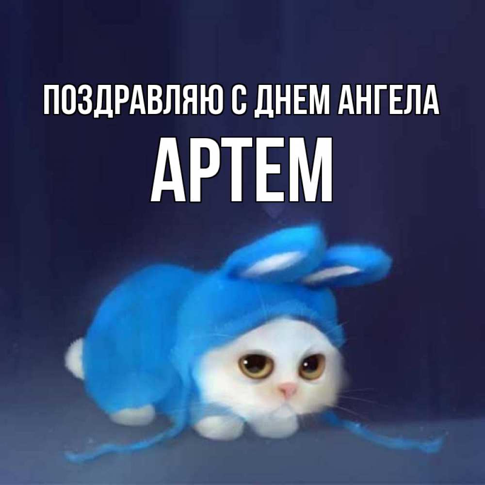 Открытка Поздравляю с днем Ангела Артем. Кот в костюме зайца желает споки ноки. кот в голубом костюме кролика с ушками