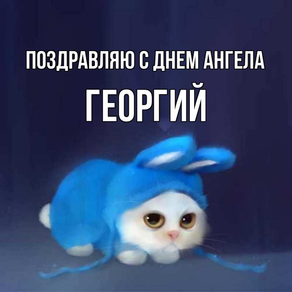 Открытка Поздравляю с днем Ангела Георгий. Кот в костюме зайца желает споки ноки. кот в голубом костюме кролика с ушками