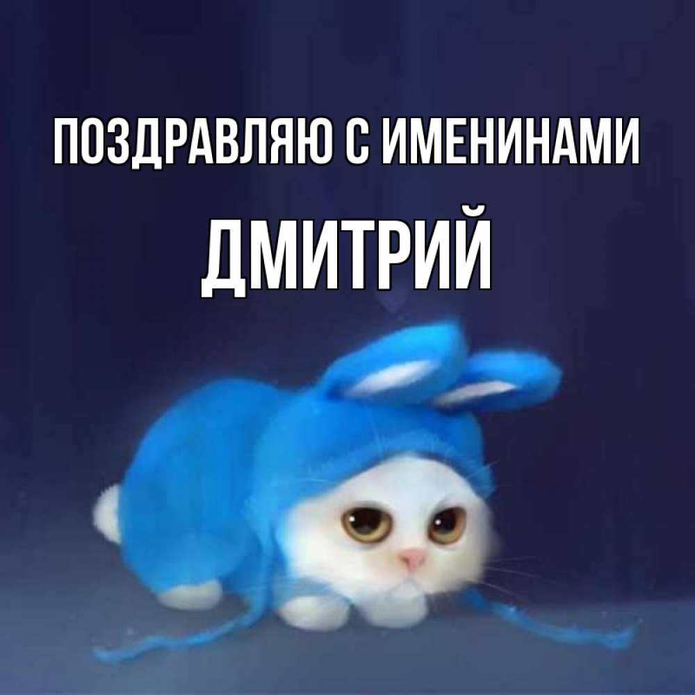 Открытка Поздравляю с именинами Дмитрий. Кот в костюме зайца желает споки ноки. кот в голубом костюме кролика с ушками