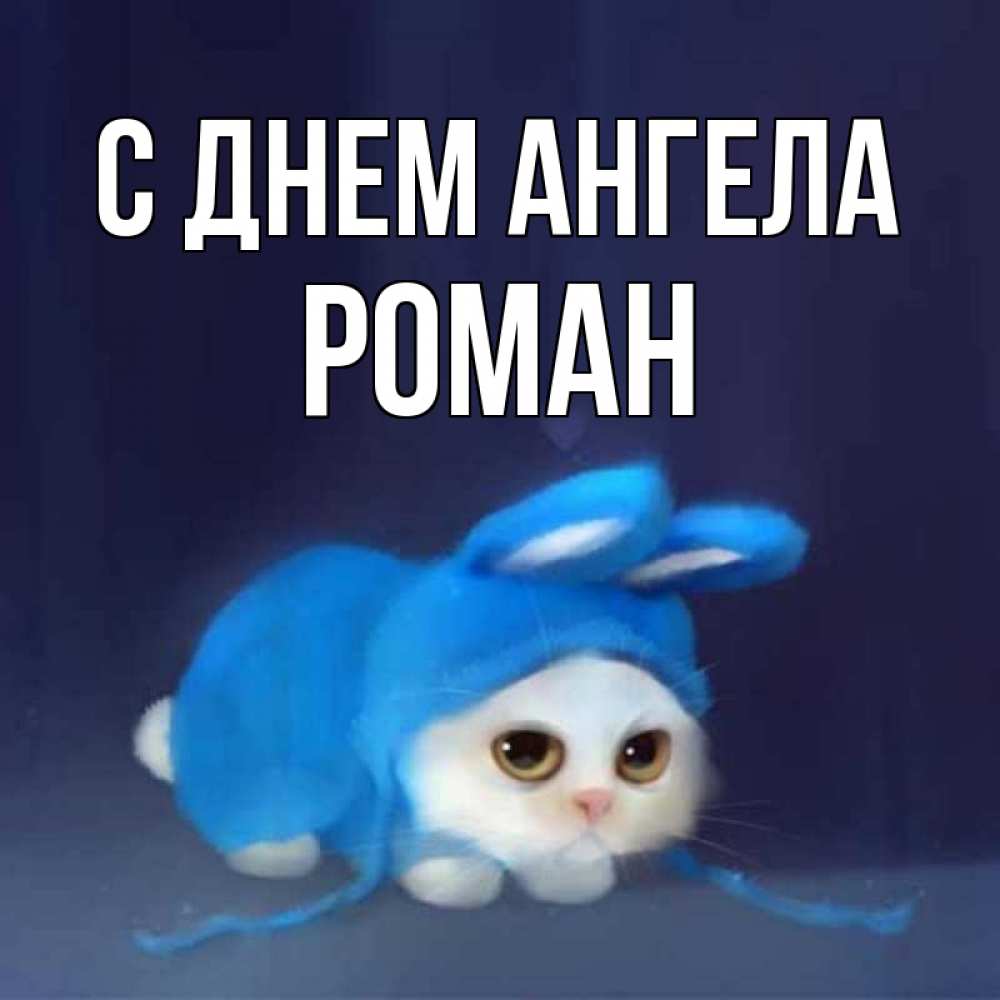Открытка С днем Ангела Роман. Кот в костюме зайца желает споки ноки. кот в голубом костюме кролика с ушками