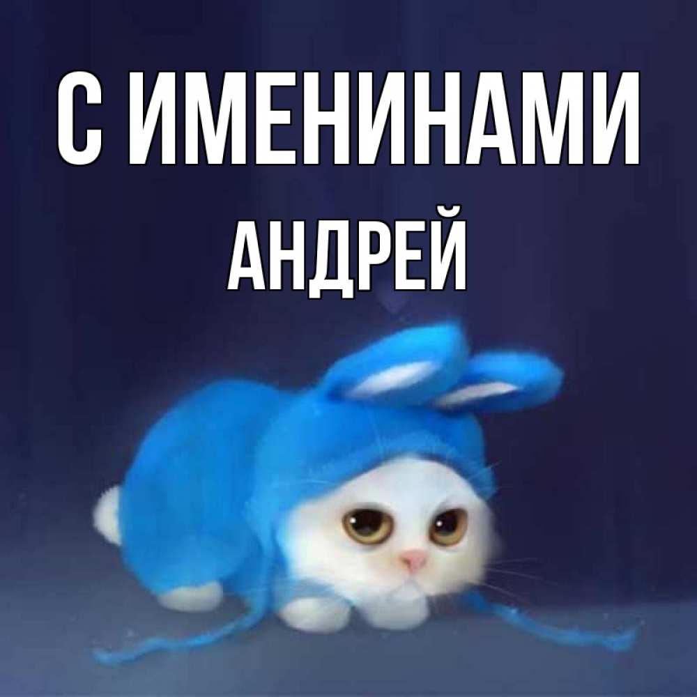Открытка С именинами Андрей. Кот в костюме зайца желает споки ноки. кот в голубом костюме кролика с ушками