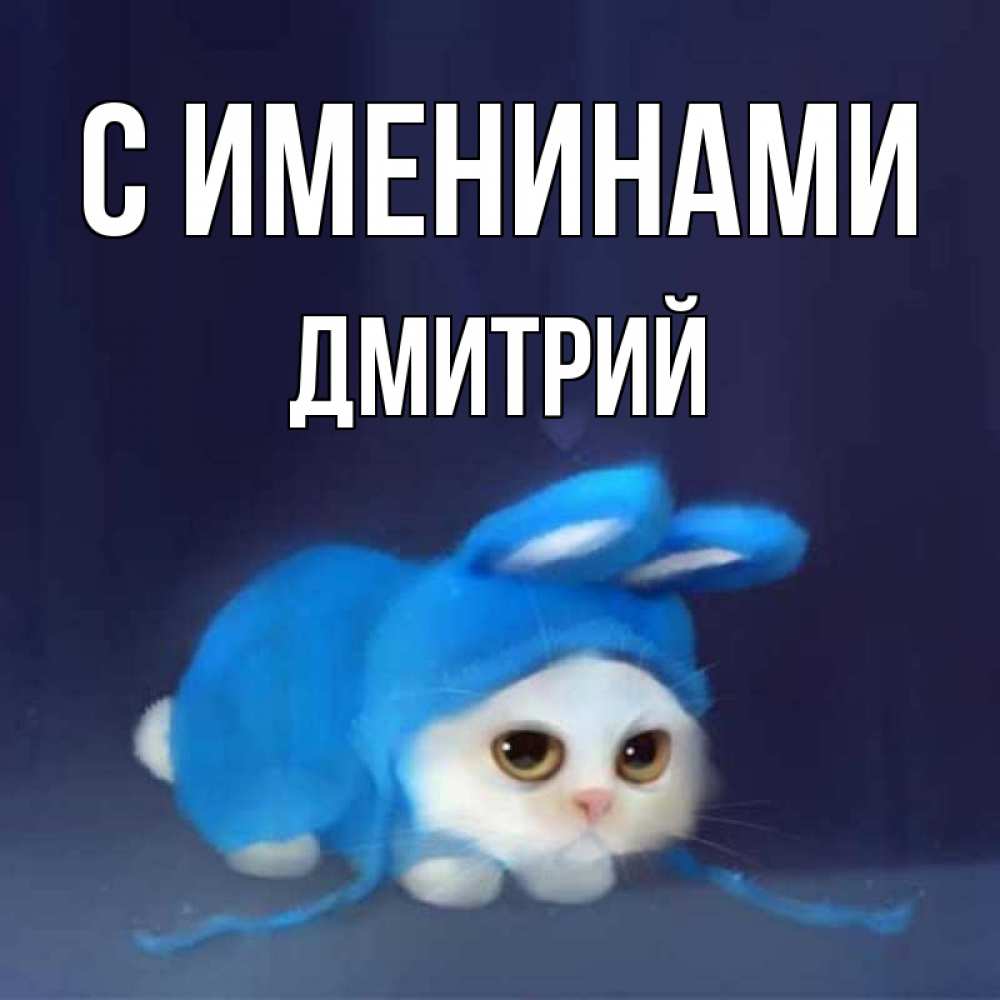 Открытка С именинами Дмитрий. Кот в костюме зайца желает споки ноки. кот в голубом костюме кролика с ушками