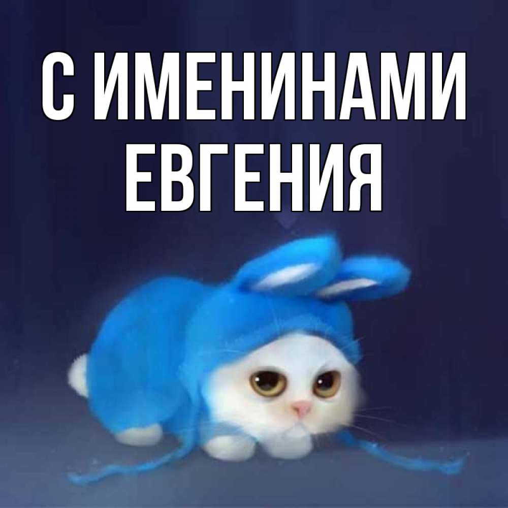 Открытка С именинами Евгения. Кот в костюме зайца желает споки ноки. кот в голубом костюме кролика с ушками