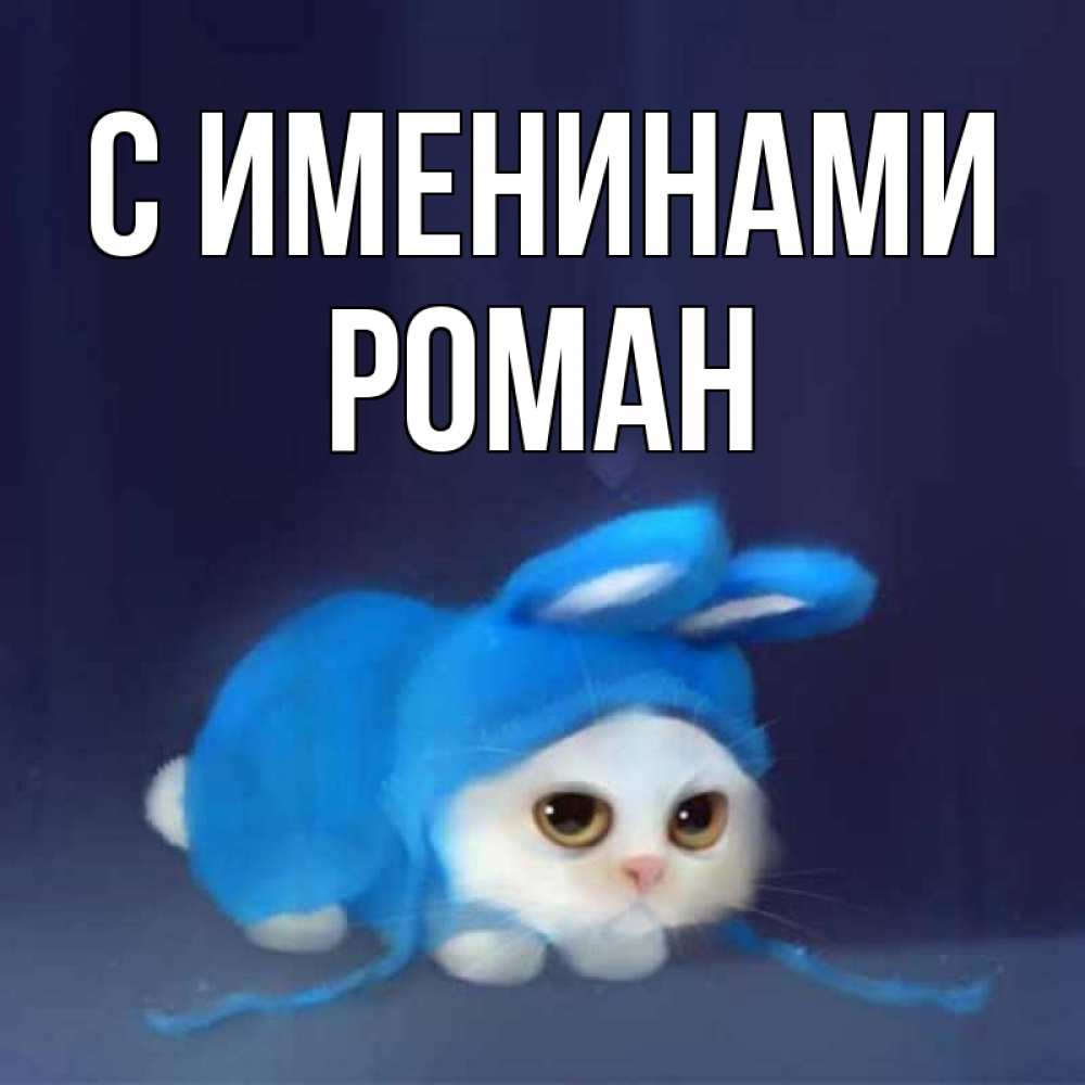 Открытка С именинами Роман. Кот в костюме зайца желает споки ноки. кот в голубом костюме кролика с ушками