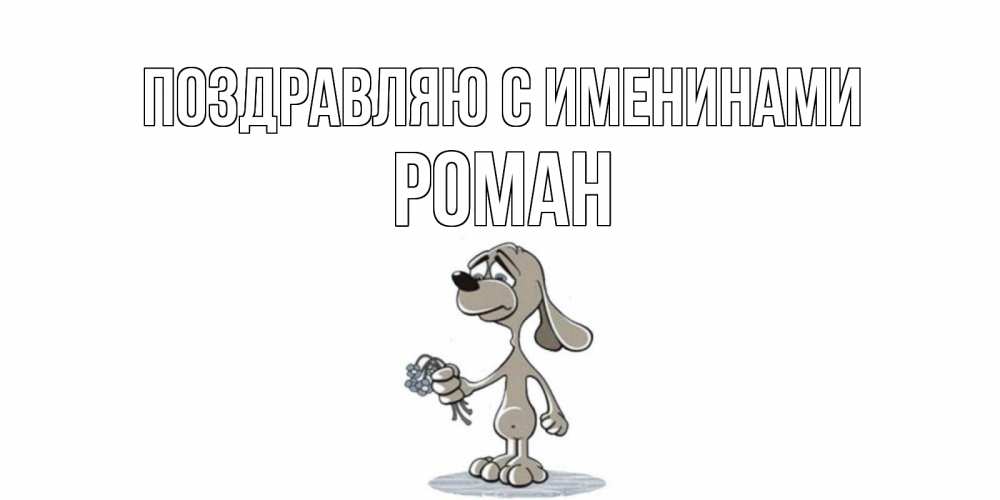 Открытка Поздравляю с именинами Роман. песик скучает и дарит цветы. я по тебе скучаю с песиком