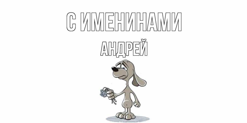 Открытка С именинами Андрей. песик скучает и дарит цветы. я по тебе скучаю с песиком