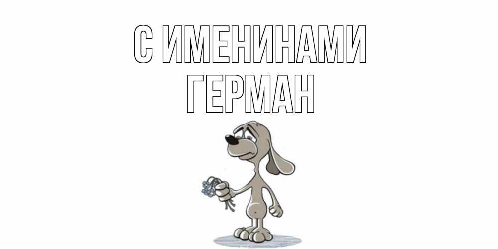 Открытка С именинами Герман. песик скучает и дарит цветы. я по тебе скучаю с песиком