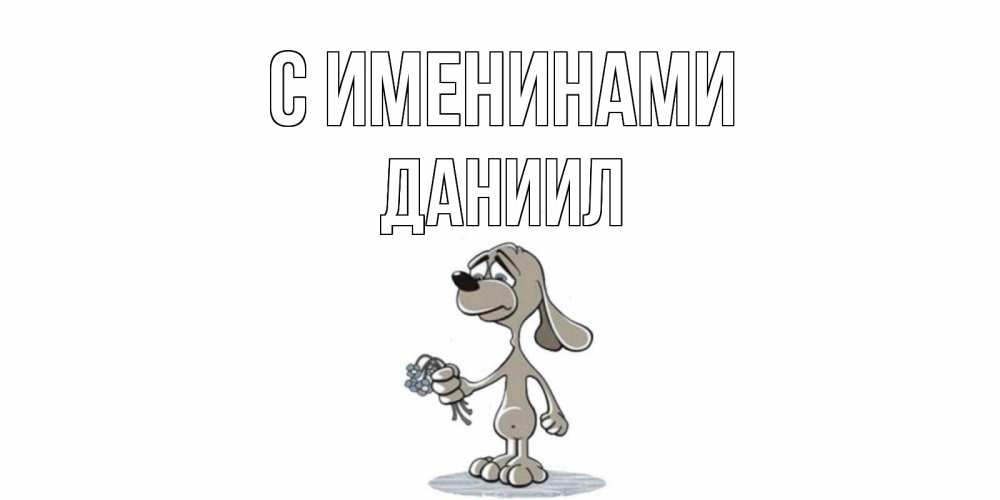 Открытка С именинами Даниил. песик скучает и дарит цветы. я по тебе скучаю с песиком