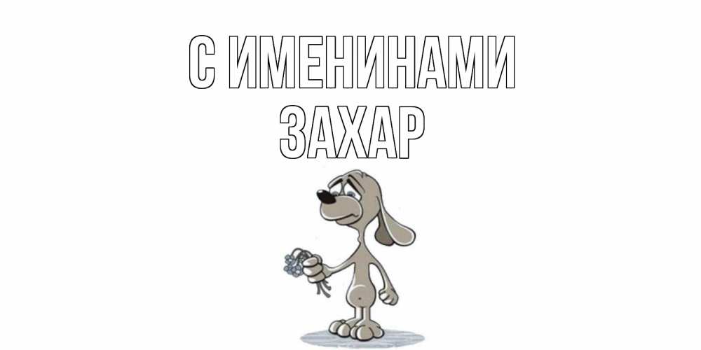 Открытка С именинами Захар. песик скучает и дарит цветы. я по тебе скучаю с песиком